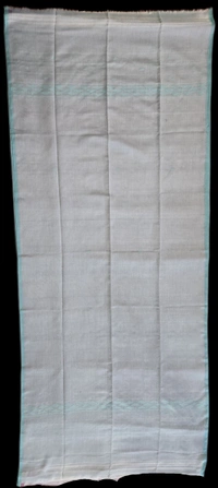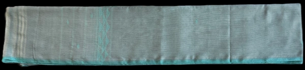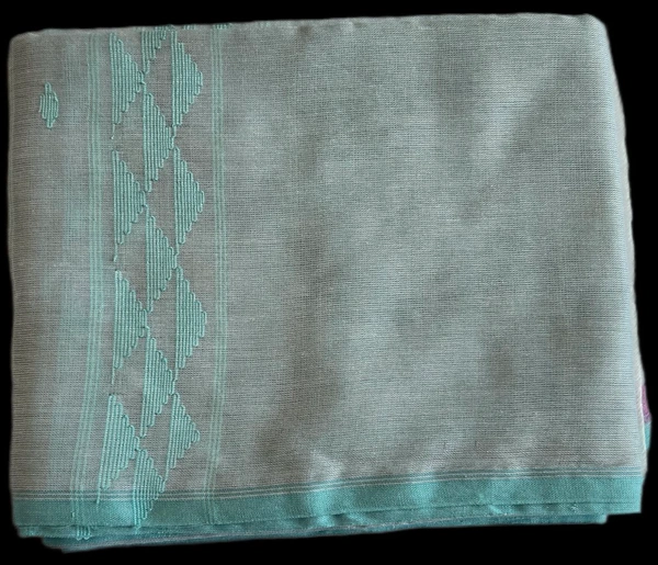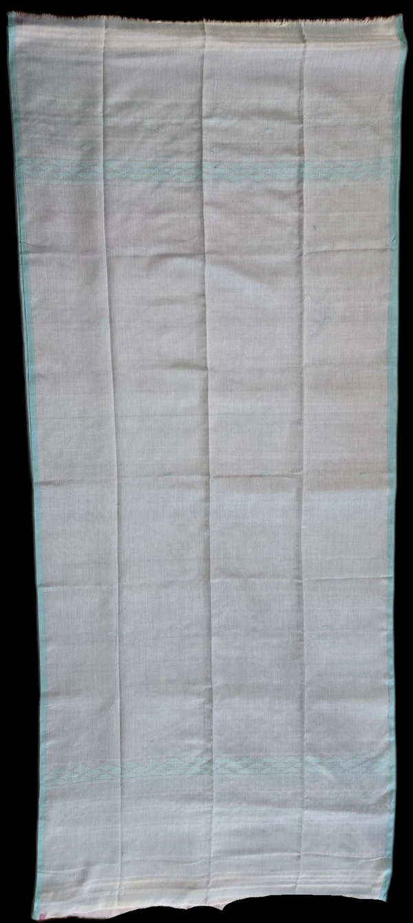 Elevate your traditional wardrobe with this exquisite Manipuri Reshmi Muga cloth. Crafted with the delicate precision characteristic of Manipuri handloom, this piece features a serene light blue base that exudes elegance and simplicity. The fabric is adorned with a striking teal (cyan) border, showcasing a classic geometric triangle motif that adds a touch of intricate cultural artistry to the minimalist design.